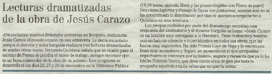 «¡Necesitamos muchos femandos quintanas en Burgos!», exclamaba Jesús Carazo el pasado verano en una entrevista. Lo decía encantado porque el director y actor burgalés realizará tres lecturas dramatizadas de sendas obras suyas. Femando Quintana señala que en cuanto pase el estreno de Presas se pondrá el mono de trabajo, aunque reconoce que es un buen conocedor de la obra de su paisano. Este programa se desarrollará los días 26,27 y 28 de noviembre en la Biblioteca Pública