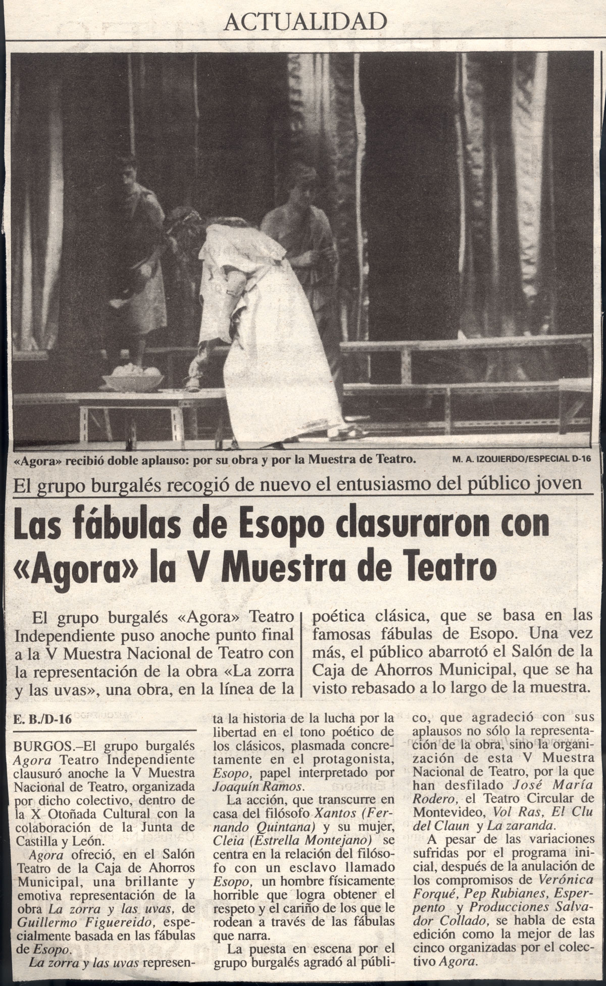 Agora ofreció, en el Salón Teatro de la Caja de Ahorros Municipal, una brillante y emotiva representación de la obra La zorra y las uvas, de Guillermo Figuereido, especialmente basada en las fábulas de Esopo.