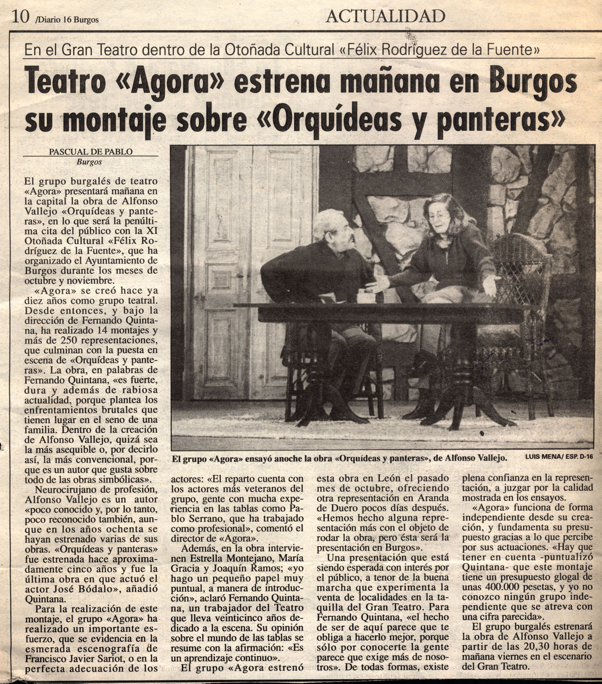 Burgos (J. Saiz).- Fernando Quintana, además de actor y director de la Escuela Municipal de Teatro es también el encargado de dirigir el Grupo de Teatro «Agora» que hoy, día 23, presenta en el Gran Teatro, la obra «Orquídeas y Panteras», original de Alfonso Vallejo; un autor que, según Quintana, es poco conocido y reconocido por la falta de conexión entre el público y los numerosos simbolismos que introduce en sus textos.