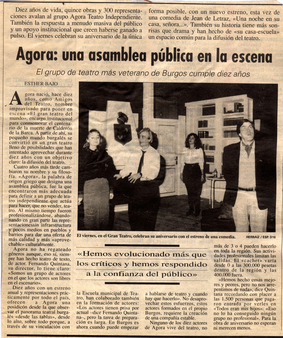 Diez años con un estreno anual y representaciones prácticamente por todo el país, ofrecen a Agora una posidicón desde la que observar el panorama teatral burgalés «desde las tablas», desde lo alto, sobre todo porque, a través de su vinculación con la Escuela municipal de Teatro, han colaborado también en la formación de actores: «Los actores tienen prisa por actual -dice Femando Quintana-, pero la tarea de preparación es larga. En Burgos es ahora cuando puede empezar a hablarse de teatro y cuando hay que hacerlo». No desaprovechar estos esfuerzos, estos actores formados en el propio Burgos, requiere la creación de una compañía estable.