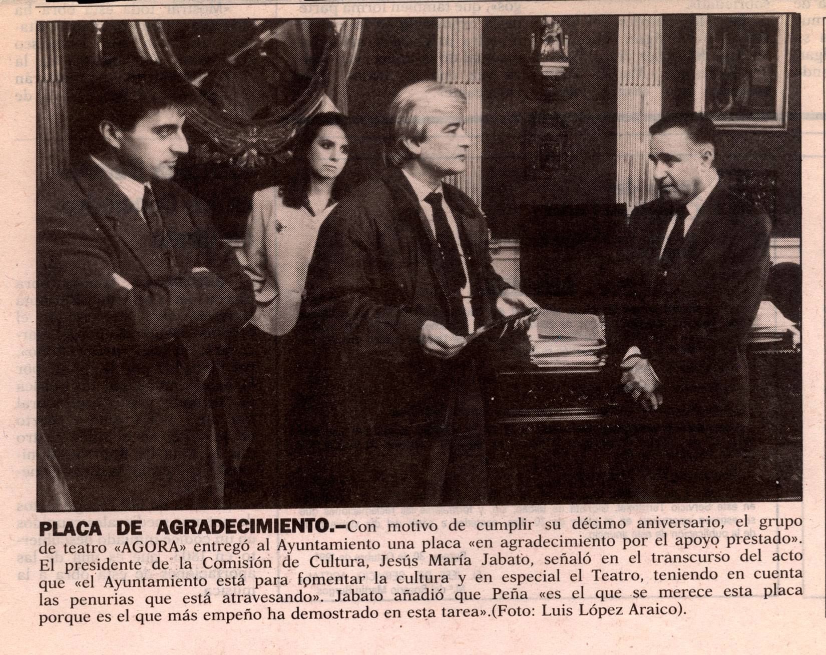 Con motivo de cumplir su décimo aniversario, el grupo de teatro «AGORA» entregó al Ayuntamiento una placa «en agradecimiento por el apoyo prestado». El presidente de la Comisión de Cultura, Jesús María Jabato, señaló en el transcurso del acto que «el Ayuntamiento está para fpmentar la cultura y en especial el Teatro, teniendo en cuenta las penurias que está atravesando». Jabato añadió que Peña «es el que se merece esta placa porque es el que más empeño ha demostrado en esta tarea».