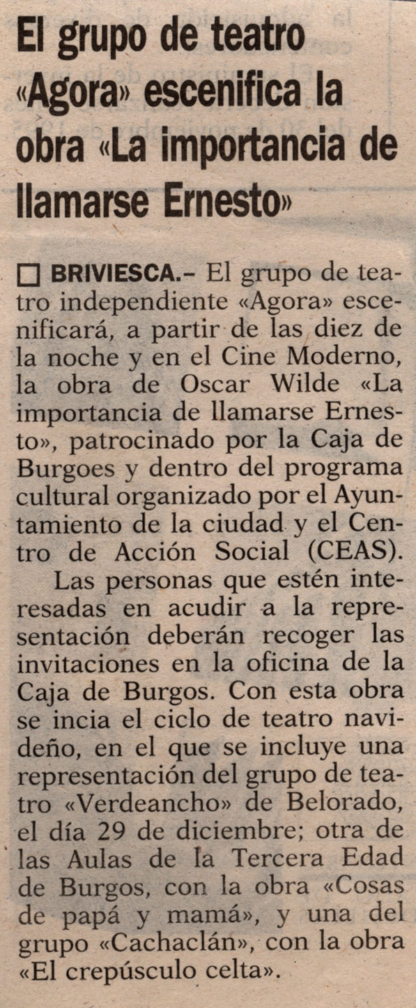 BRIVIESCA.- El grupo de teatro independiente «Agora» escenificará, a partir de las diez de la noche y en el Cine Moderno, la obra de Oscar Wilde «La importancia de llamarse Ernesto», patrocinado por la Caja de Burgoes y dentro del programa cultural organizado por el Ayuntamiento de la ciudad y el Centro de Acción Social (CEAS).