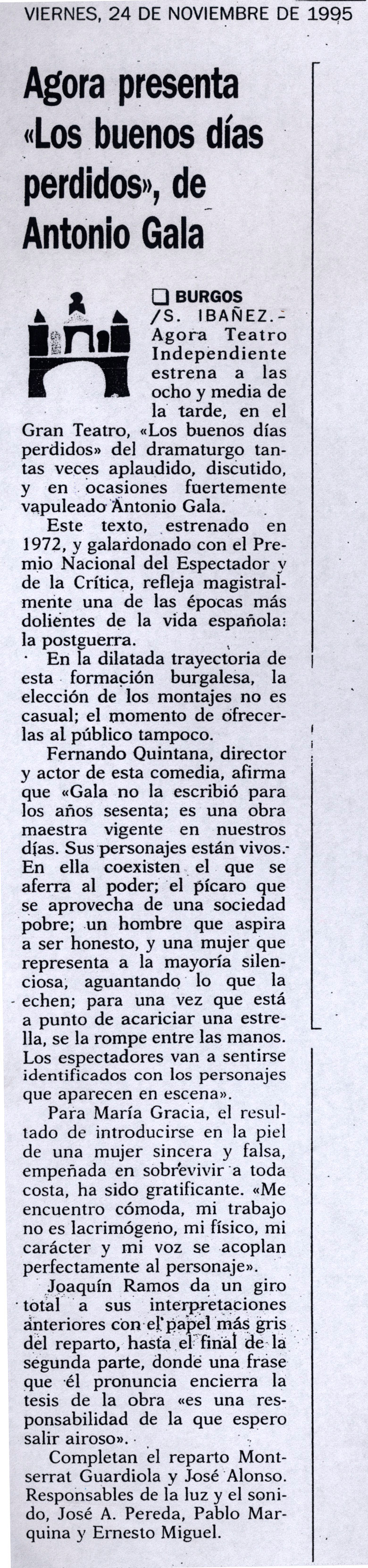 Coincidiendo con la celebración del quince aniversario de su creación, el grupo burgalés Agora Teatro Independiente puso en escena ayer «Los buenos días perdidos» del dramaturgo y escritor cordobés Antonio Gala, que sustituía a «El sí de las niñas» de Leandro Fernández de Moratín, clásico que no pudo ser representado por problemas técnicos de última hora. El Teatro Clunia se llenó hasta la bandera para escuchar el buen hacer de estos veteranos de las tablas, que han sido y son referente de muchos jóvenes que empiezan a pisar un escenario. Una vez más, Agora presentó un montaje cuidado en el que sus actores volcaron toda la experiencia acumulada a lo largo de los años de trabajo -20 montajes escénicos- en los que han recibido definitivamente el respaldo del público, a veces tan difícil, de esta ciudad.