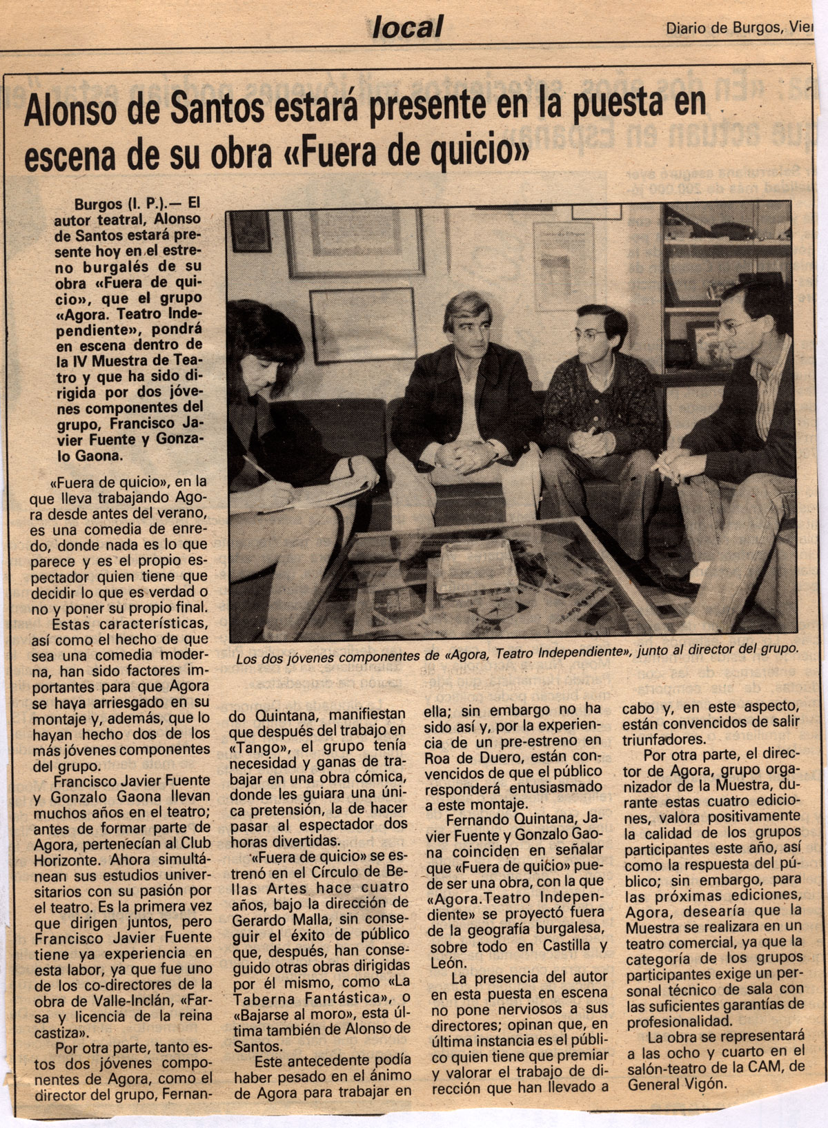 Burgos (I. P.).— El autor teatral, Alonso de Santos estará presente hoy en el estreno burgalés de su obra «Fuera de quicio», que el grupo «Agora. Teatro Independiente», pondrá en escena dentro de la IV Muestra de Teatro y que ha sido dirigida por dos jóvenes componentes del grupo, Francisco Javier Fuente y Gonzalo Gaona.