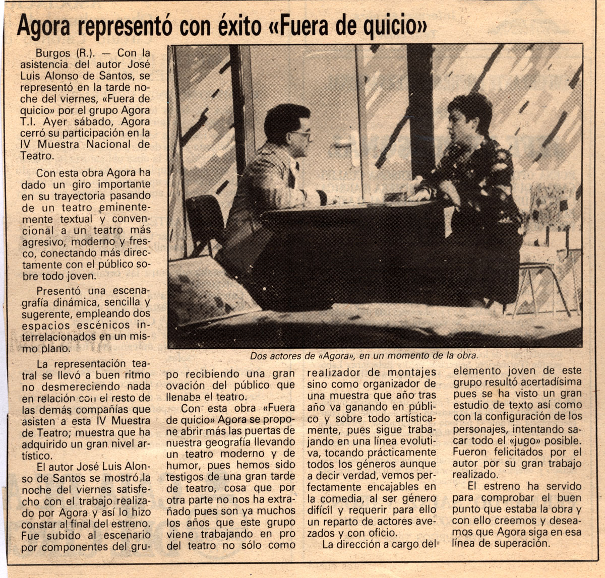 Burgos (R.). — Con la asistencia del autor José Luis Alonso de Santos, se representó en la tarde noche del viernes, «Fuera de quicio» por el grupo Agora T.l. Ayer sábado, Agora cerró su participación en la IV Muestra Nacional de Teatro.