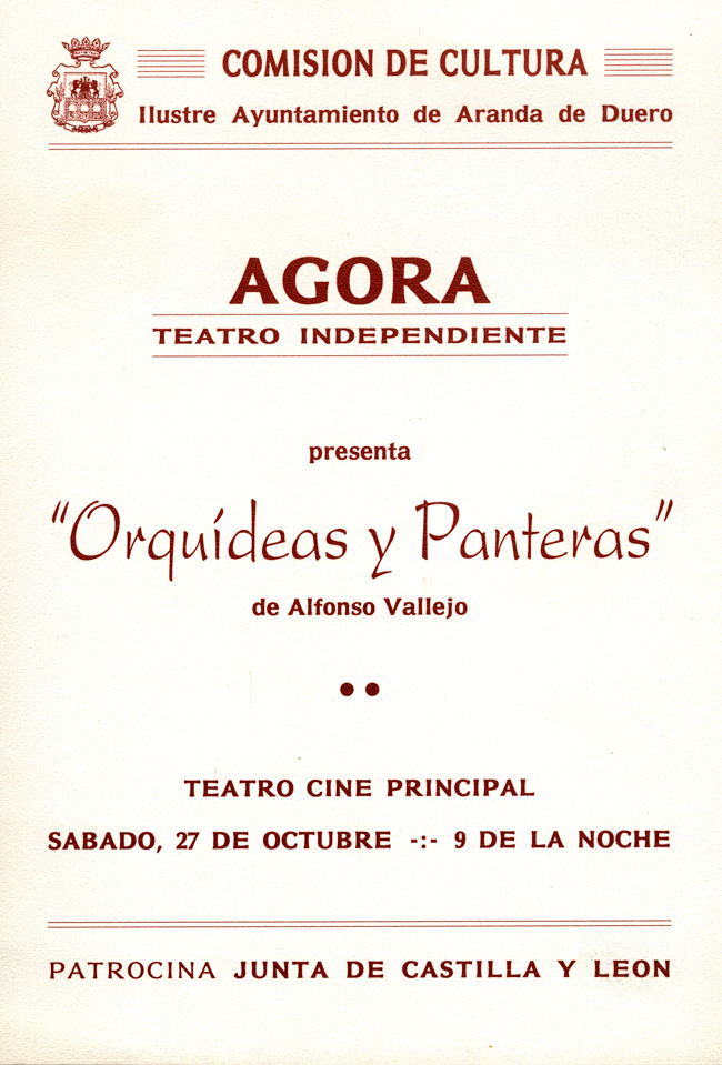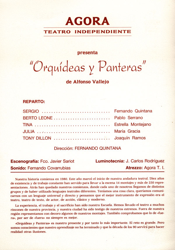 «Agora» se creó hace ya diez años como grupo teatral. Desde entonces, y bajo la dirección de Femando Quintana, ha realizado 14 montajes y más de 250 representaciones, que culminan con la puesta en escena de «Orquídeas y panteras». La obra, en palabras de Femando Quintana, «es fuerte, dura y además de rabiosa actualidad, porque plantea los enfrentamientos brutales que tienen lugar en el seno de una familia. Dentro de la creación de Alfonso Vallejo, quizá sea la más asequible o, por decirlo así, la más convencional, porque es un autor que gusta sobre todo de las obras simbólicas».