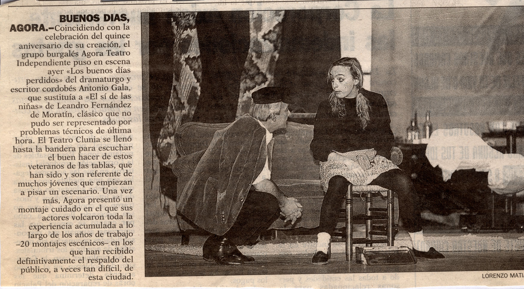 Coincidiendo con la celebración del quince aniversario de su creación, el grupo burgalés Agora Teatro Independiente puso en escena ayer «Los buenos días perdidos» del dramaturgo y escritor cordobés Antonio Gala, que sustituía a «El sí de las niñas» de Leandro Fernández de Moratín, clásico que no pudo ser representado por problemas técnicos de última hora. El Teatro Clunia se llenó hasta la bandera para escuchar el buen hacer de estos veteranos de las tablas, que han sido y son referente de muchos jóvenes que empiezan a pisar un escenario. Una vez más, Agora presentó un montaje cuidado en el que sus actores volcaron toda la experiencia acumulada a lo largo de los años de trabajo -20 montajes escénicos- en los que han recibido definitivamente el respaldo del público, a veces tan difícil, de esta ciudad.