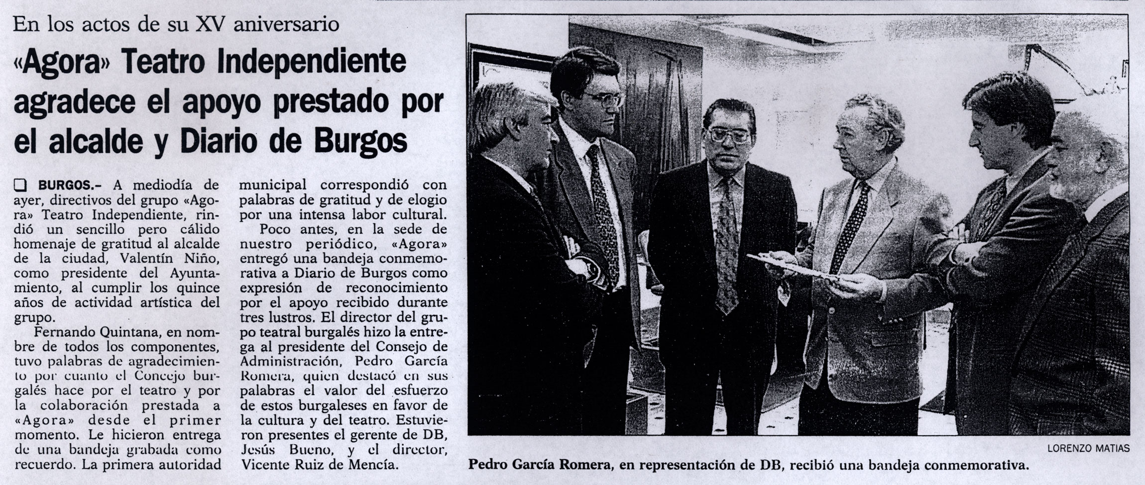 Poco antes, en la sede de nuestro periódico, «Agora» entregó una bandeja conmemorativa a Diario de Burgos como expresión de reconocimiento por el apoyo recibido durante tres lustros. El director del grupo teatral burgalés hizo la entrega al presidente del Consejo de Administración, Pedro García Romera, quien destacó en sus palabras el valor del esfuerzo de estos burgaleses en favor de la cultura y del teatro. Estuvieron presentes el gerente de DB, Jesús Bueno, y el director, Vicente Ruiz de Mencía.
