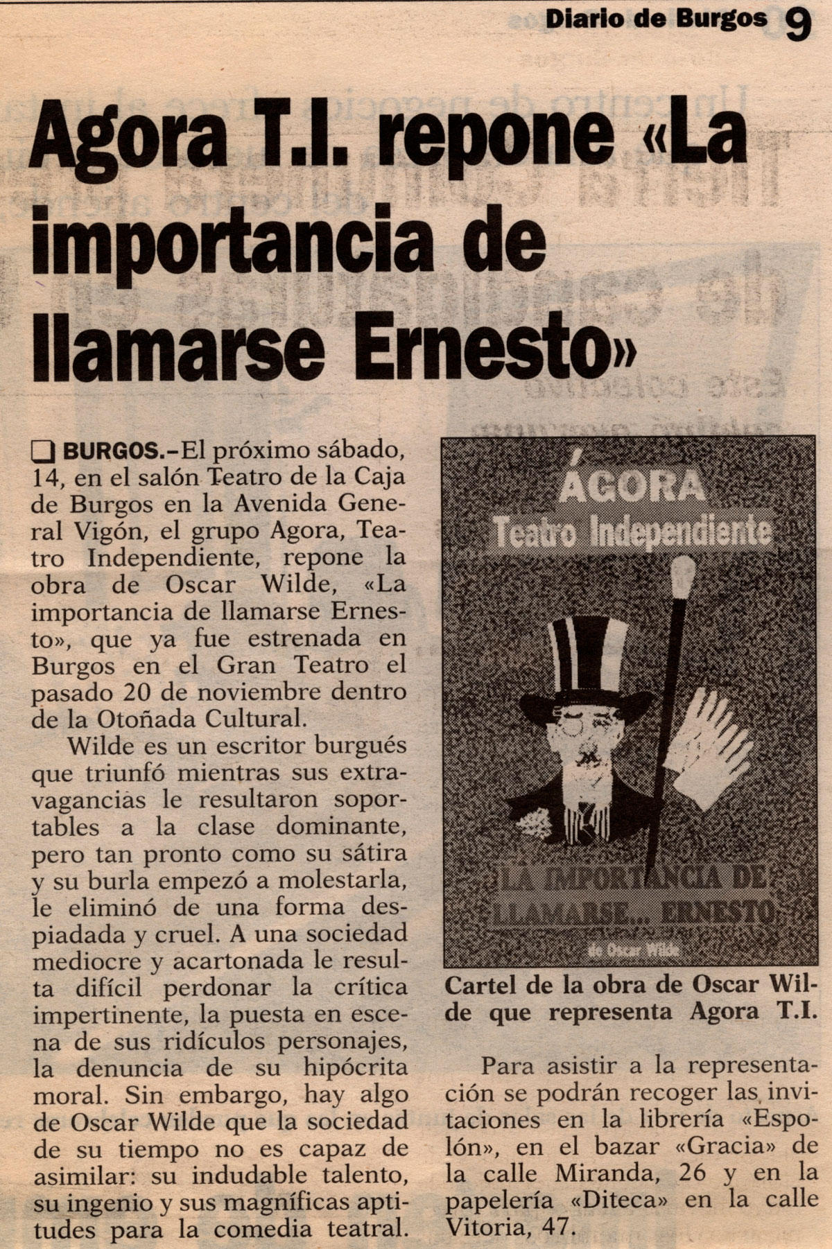 BURGOS. -El próximo sábado, 14, en el salón Teatro de la Caja de Burgos en la Avenida General Vigón, el grupo Agora, Teatro Independiente, repone la obra de Oscar Wilde, «La importancia de llamarse Ernesto», que ya fue estrenada en Burgos en el Gran Teatro el pasado 20 de noviembre dentro de la Otoñada Cultural.