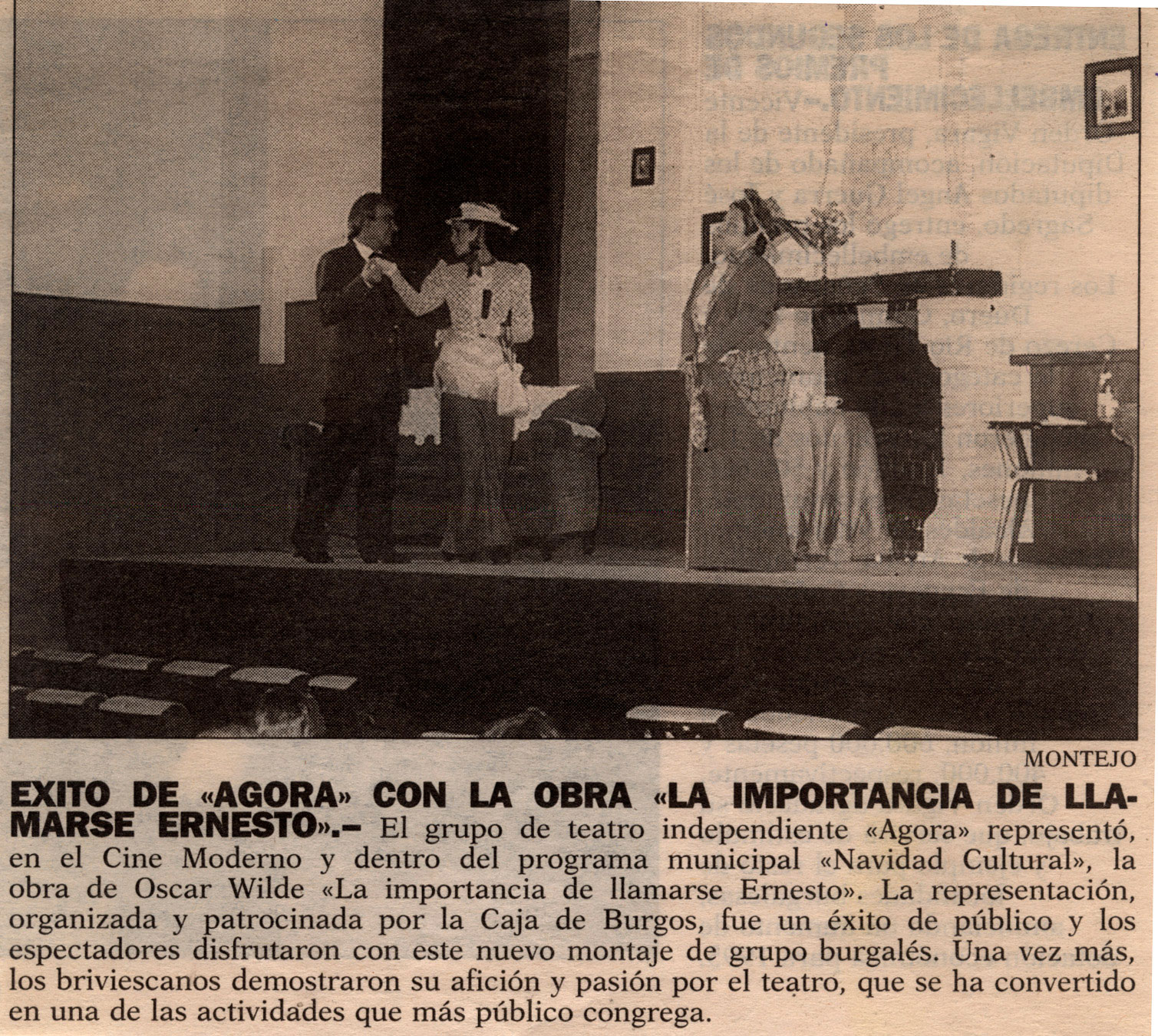El grupo de teatro independiente «Agora» representó, en el Cine Moderno y dentro del programa municipal «Navidad Cultural», la obra de Oscar Wilde «La importancia de llamarse Ernesto». La representación, organizada y patrocinada por la Caja de Burgos, fue un éxito de público y los espectadores disfrutaron con este nuevo montaje de grupo burgalés. Una vez más, los briviescanos demostraron su afición y pasión por el teatro, que se ha convertido en una de las actividades que más público congrega.